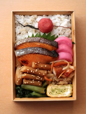 本日の弁当: 秋鮭の西京漬け焼き → 切干大根とさつま揚げの炒め煮 → かぶの葉漬け かぶの梅酢漬け ごぼうの醤油漬け 地···