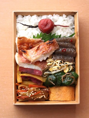 本日の弁当: 赤魚の塩焼き → さつまいもの塩バター炒め → ブロッコリーの芯のきんぴら 生芋こんにゃくの炒め煮 → ···
