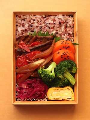 本日の弁当: 牛玉ねぎトマト炒め → 紫キャベツのザワークラウト → 人参の甘煮 → ブロッコリーのオイル蒸し焼き &r···