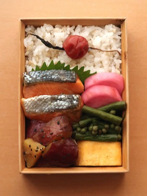 本日の弁当: 鮭の西京漬け焼き → さつまいもの甘煮 → かぶの梅酢漬け いんげんの山椒漬け → 玉子焼き 大葉 梅干···