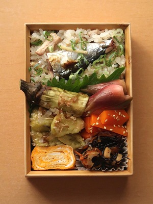 本日の弁当: 焼き茄子+おかか醤油 茗荷の甘酢漬け → 人参の甘煮 → 芽ひじきとちくわの炒め煮 → 玉子焼き 大葉 ···