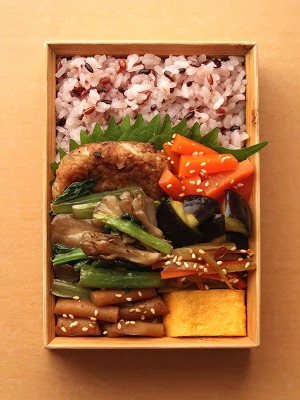 本日の弁当: 鯖のハンバーグ → きのこと小松菜のバター炒め → ごぼうの醤油漬け 人参の甘煮 → 秋茄子の辛子漬け ···